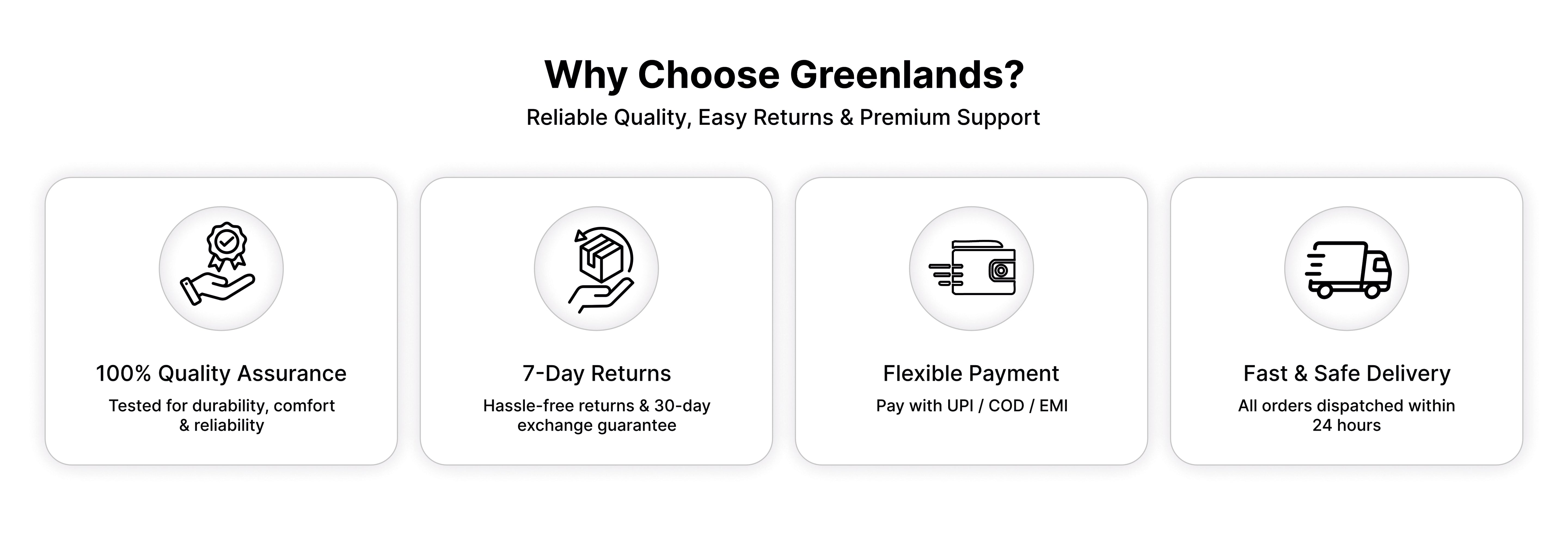 - Support: For any questions or concerns regarding your return, contact our customer service team at cs@greenlands.biz or +91 7060505550.